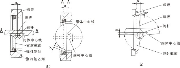 蝶板的回轉中心(即閥桿的中心)與蝶板密封截面偏置一個尺寸α,并與閥體通道軸線偏置一個尺寸β。