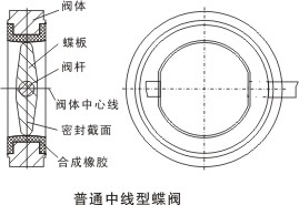 蝶板的回轉(zhuǎn)中心(即閥桿的中心)位于閥體的中心線和蝶板的密封面截面上。