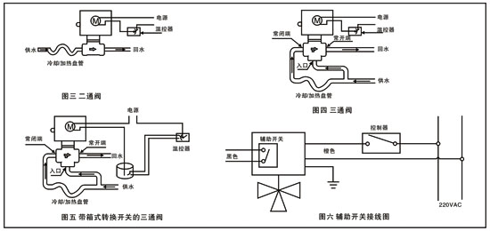 常閉二通閥和混合三通閥的安裝如圖形3、4所示。對于高層建筑物,應在底層支管上采用減壓閥。安裝閥體時,應注意閥體的箭頭指向,若帶有輔助開關,其接線如圖6所示。