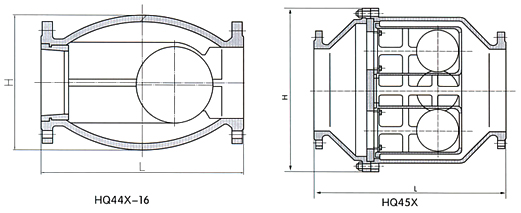 HQ44X-10 16外尺寸(單球式) 公稱通徑 200 250 300 350 400 450 600 700 800 900 1000 L(mm) 550 650 750 850 950 1050 1350 1450 1650 1900 2100 H(mm) 510 570 640 715 815 825 1155 1260 1350 1660 1700 連接尺寸 法蘭連接尺寸PN1.0MPa按GB4216.4-84;PNl.6MPa按GB4216.5-84標準